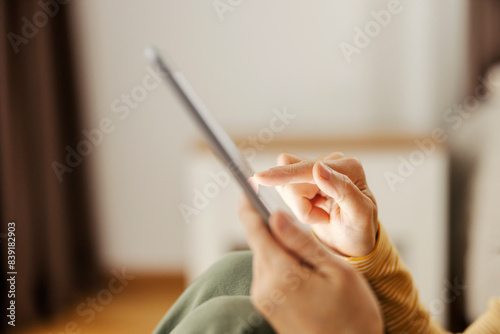 tablet, finger, closeup, scroll, cyberspace, network, cyberspace, online, tech, technology, apartment, home, people, real people, woman, bed, bedchamber, person, display, electronic, lady, relax, rest, screen, holding, communication, device, copy space, using, touch, adult, digital, hand