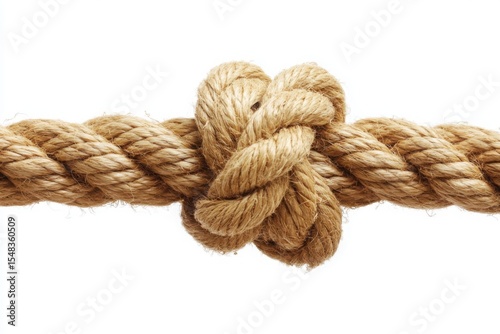 Close up of a knotted brown rope against a plain white background studio shot