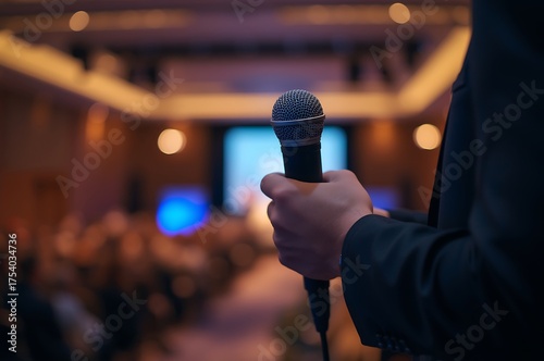 microphone, speaker, stage, presentation, performance, event, audience, conference, seminar, concert, speech, public, speaking, hand, holding, person, man, woman, entertainer, lecturer, host, mc, broadcasting, audio, sound, equipment, technology, light, blurred, background, out, of, sharpened, bokeh, space, venue, indoor, gathering, meeting, corporate, business, communication, information, education, entertainment, live, show