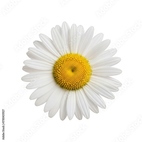 Close up of a single white daisy flower with a yellow center isolated on black transparent background