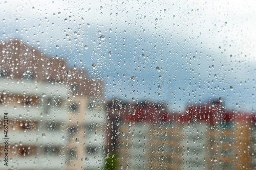 Close up of a window with rain drops falling down. Focus on rain drops. Rain drops on rainy day on outside window glass with blurred edges. Rain outside window pane in spring day.