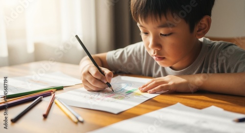 Close up of a young Asian boy drawing with colored pencils at a table. A focused child creating art for a school project. Childhood education and creativity concept