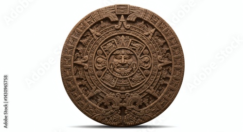Close up of an aztec sun stone with intricate carvings on a white background in studio lighting