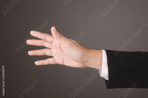 Close up of Asian Male Hand on gray Background in studio Taking With Studio Light. Touch Action.