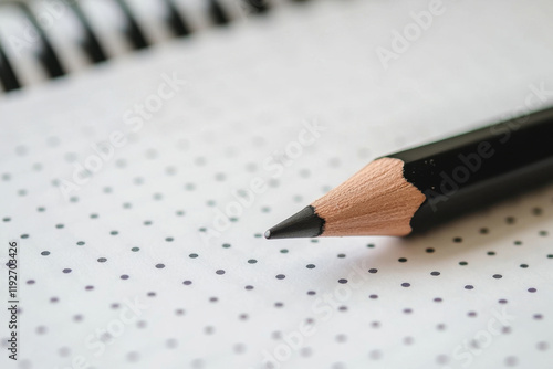 close up of black pencil resting on dotted notebook page, showcasing pencil sharp tip and natural light illuminating scene