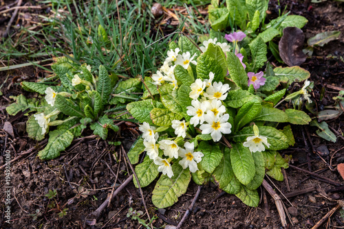 primrose, flowering plant, forest floor, new life, vitality, environment, gardening, horticulture, selective focus, spring flower, wildflower, garden flower, fresh flower, green leaf, natural background, floral background, seasonal change, rebirth, natural beauty, ecology, flora, botanical, closeup, soft light, colorful flowers, yellow flower, purple flower