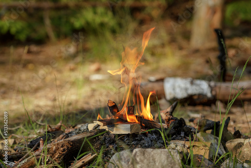 Close up of burning timber bonfire in summer forest..The concept of adventure, travel, tourism, camping, survival and evacuation.