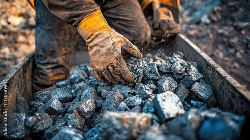 coal, mining, miner, gloved, hand, men at work, fuel, energy, resource, industry, hard, work, manual, labor, raw, material, black, grey, brown, dirty, gritty, rough, texture, solid, lump, piece, container, box, handling, sorting, working, industrial, occupation, mineral, natural, deposit, earth, power, fossil, glove, metal