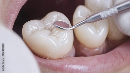 Close up of dentist's hand using a dental probe to examine a patient's tooth