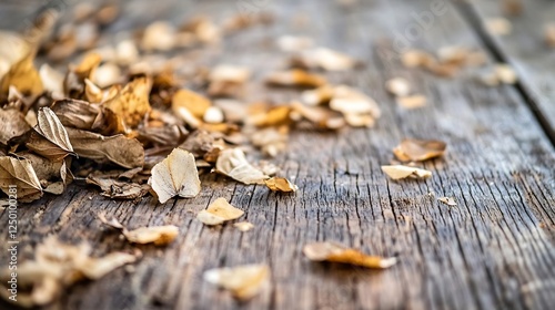 Close Up of Dried Leaves on Weathered Wooden Surface : Generative AI