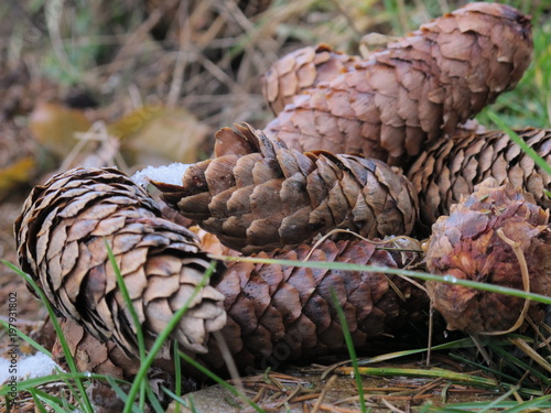 Close up of fir cones on ground