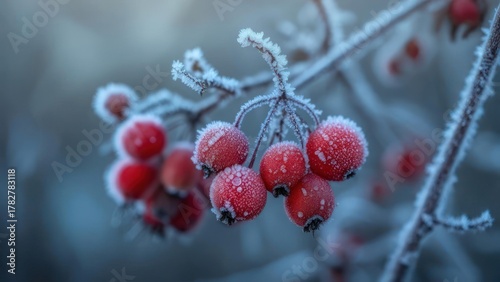 berry, red, frost, glacé, tree branch, winter, cold, nature, closeup, macro, seasonal, beauty, background, texture, detail, natural, flora, plant, environment, growth, outdoors, daylight, crystal, ice, structure, organic, isolated, copy space, composition, wallpaper, botanical, fragility, surface, visual, decorative, element, art, photo, image, concept, aesthetic, bright, vibrant, blurred, sharpened, serene, calm