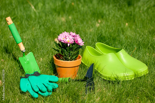 gardening, tool, green, grass, lawn, village, view, landscape, still life, flower, pot, relax, nature, flora, summer, sun, shine, glove, gardener, hobby, plant, shoe