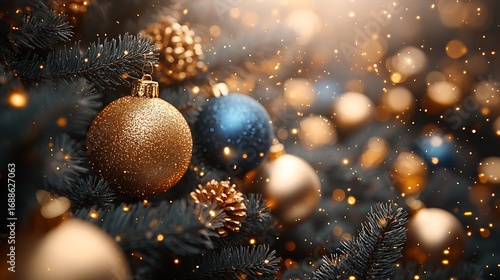 Close up of golden and blue Christmas ornaments on a pine tree with bokeh lights branch