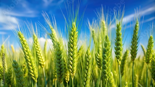 Close up of green ears of wheat against blue sky, wheat, close up, green, ears, agriculture, crop, farming, healthy, organic, fresh