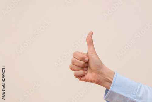 Close up of hand showing thumb up sign for agreement and success on beige background with copy space