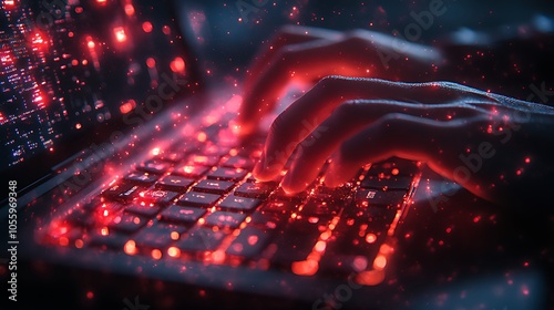 typing, hand, keyboard, laptop, computer, technology, digital, network, online, cyberspace, datum, code, coding, programmer, developer, engineer, software, application, website, programming, design, innovation, future, progress, science, creativity, work, business, communication, information, electronic, wireless, cyber, glow, sparkle, light, red, dark, abstract, background, illustration, concept