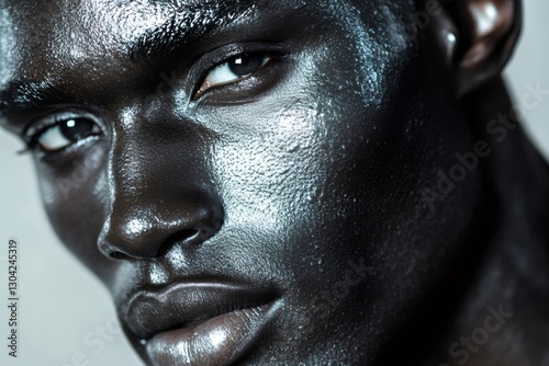 Close up of male model with silver makeup on dark skin, showcasing a unique and artistic look for a beauty or fashion campaign