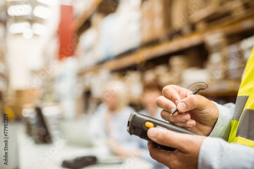 mature adult, man, male, caucasian, woman, female, warehouse, industry, business, shipping, working, logistic, crate, job, career, holding, device, hand-held, technology, computer, indoor