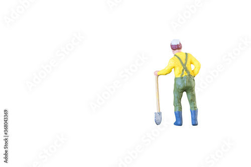 Close up of Miniature farmer people isolated with clipping path on white background . Elegant Design with copy space for placement your text, mock up for farmer and gradening concept
