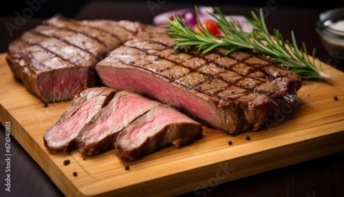 Close up of mouthwatering ribeye steak slices, perfectly cooked to juicy tenderness and rich flavor