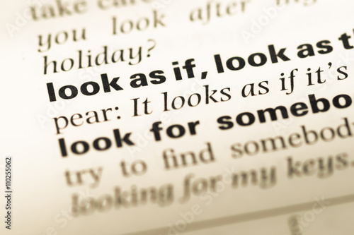Close up of old English dictionary page with word look as if