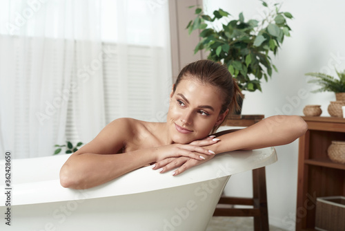 Close up of portrait of happy pretty woman with attractive smile relaxing while taking bath in bright apartment during romantic atmosphere