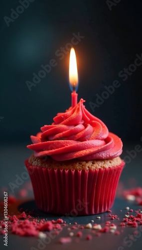Close up of red cupcake with single candle burning brightly, decoration, event