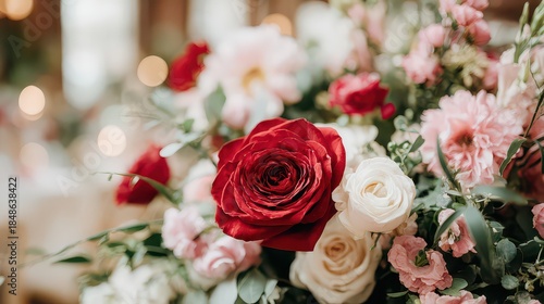 flower, rose, floral, red, pink, bouquet, arrangement, centrepiece, wedding, decoration, table, event, celebration, romance, bloom, blossom, flora, elegant, soft, light, romantic, festive, beautiful, fresh, vibrant, leaf, stem, green, cream, sharpened, closeup, interior, gathering, party, anniversary, birthday, special occasion, decorative, festivity, indoor, artistic, table setting, floral arrangement, soft light, celebratory