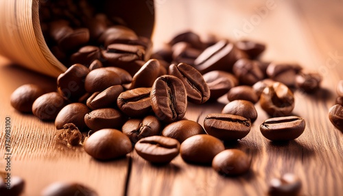 Close Up Of Roasted Coffee Beans Scattered On A Wooden Surface