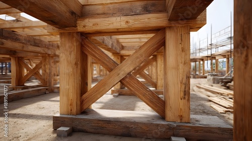 Close up of sturdy wooden beams and crisscrossed braces supporting a structure at a construction site
