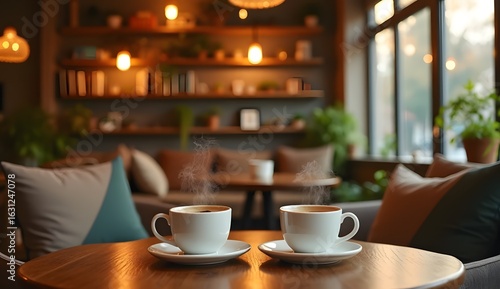 hot drink, cafes, cafes, cup, table, coffee cup, interior, closeup, 2, drink, beverage, latte, cappuccino, espresso, mug, saucer, eatery, bar, cafes, morning, breakfast, lunch, food, food and drink, cafe drink, relax, relaxing, leisure, lifestyle, cosy, warm, warmth, bright, light, sunlight, window, window light, wooden table, furniture
