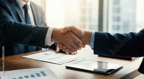 close, up, diverse, adult, man, formal, suit, shaking, hand, wooden, desk, business, partnership, agreements, contract, success, collaboration, corporate, office, professional, financial, report, chart, tablet, digital, datum, investment, teamwork, deal, greeting, trust, strategy, work, leadership, entrepreneur, finance, economy, document, paperwork, interior, bright, sunlit, meeting, negotiation, executive, career, commitment, vision, goal
