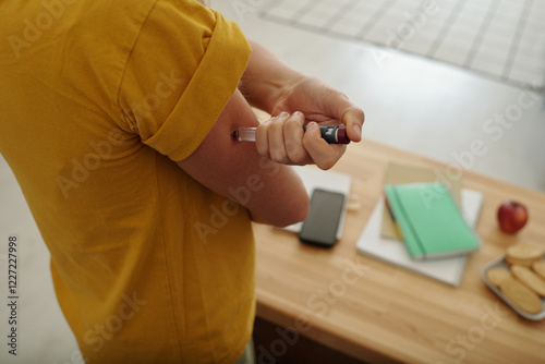 Close up of unrecognizable person with diabetes doing insulin injection in arm using injector pen at home copy space