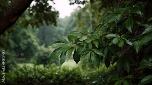 Close up of wet glossy green leaves on a branch set against a soft blurred backdrop of a verdant forest