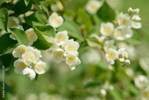 Close up of white jasmine flowers in a garden. Flowering jasmine bush in sunny summer day. Nature background.