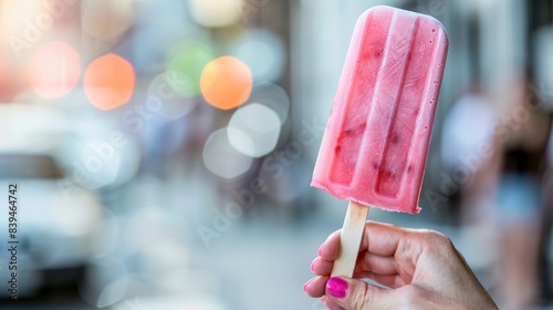 Close up of woman s hand holding strawberry popsicle on blurred background with space for text