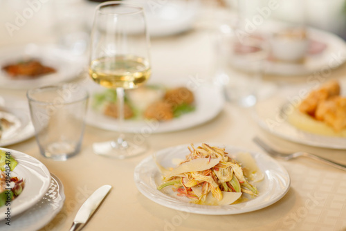Close up on italian traditional northern food on a restaurant table. Many dishes are visible.