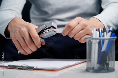 Close up on midsection on hands of unknown caucasian man male holding and using metal stapler on documents by the table while working from home during the quarantine pandemic lockdown front view