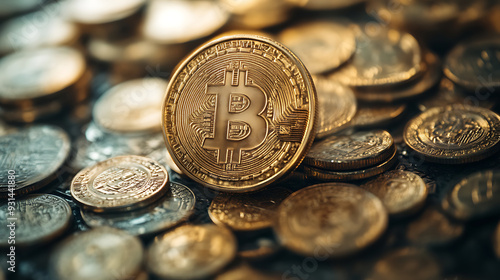 Close up photo of bitcoin crypto currency. Generative AI illustration