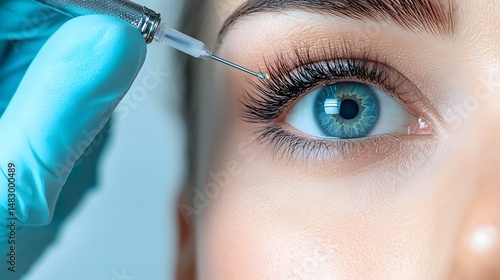 Close up photograph of a patient undergoing a non invasive plasma pen treatment for eyelid tightening showcased in a sterile and professional medical setting with ample copy space for text overlay