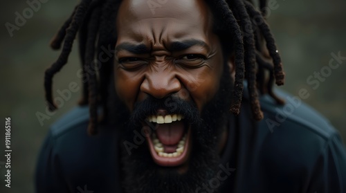 Close up portrait of a man screaming with intense emotion and dreadlocks suitable for anger concepts. This expressive face highlights stress and loud vocal shouting.