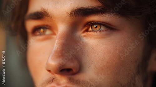 Close up portrait of a young man s thoughtful gaze during golden hour bathed in warm soft sunlight