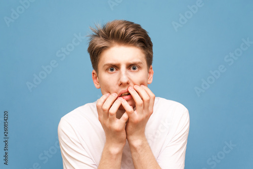 fear, afraid, face, isolated, man, portrait, adult, attractive, background, emotional, fright, frightened, guy, photogenic, male, person, scared, scream, shock, studio, surprise, panicked, white, young, hand, amazed, amazement, amazement, blank, casual attire, god, model, mouth, oh, stress, student, t-shirt, astonished, cowardly, gesture, secret, caucasian, emotion, blue, girl, teenage, expressive, 20s, worried