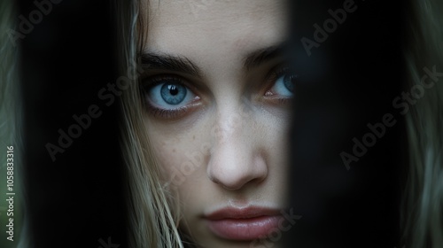 Close up Portrait of Woman with Blue Eyes Looking Through Window
