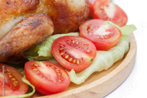 close up roast chicken on wooden plate isolated on white