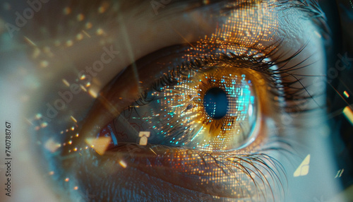 Close up shot of a user accessing a next generation computer their eye reflected on the screen which displays the authentication process in real time capturing the intricate details of
