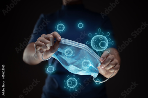Close up shot of hands holding protective face mask with virus hologram effect.