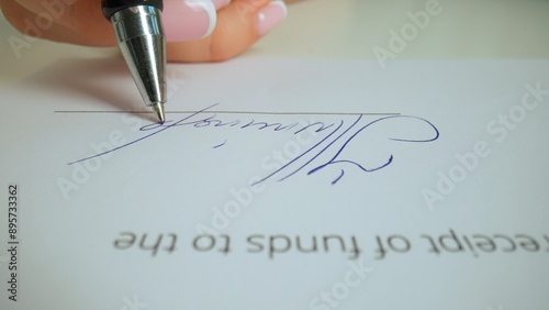 Close up shot of woman hand working with document, pen in female hand writing a personal signature in financial or business document.