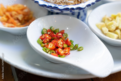 close up sliced red and green chilli on white spoon for miang kum ingredient